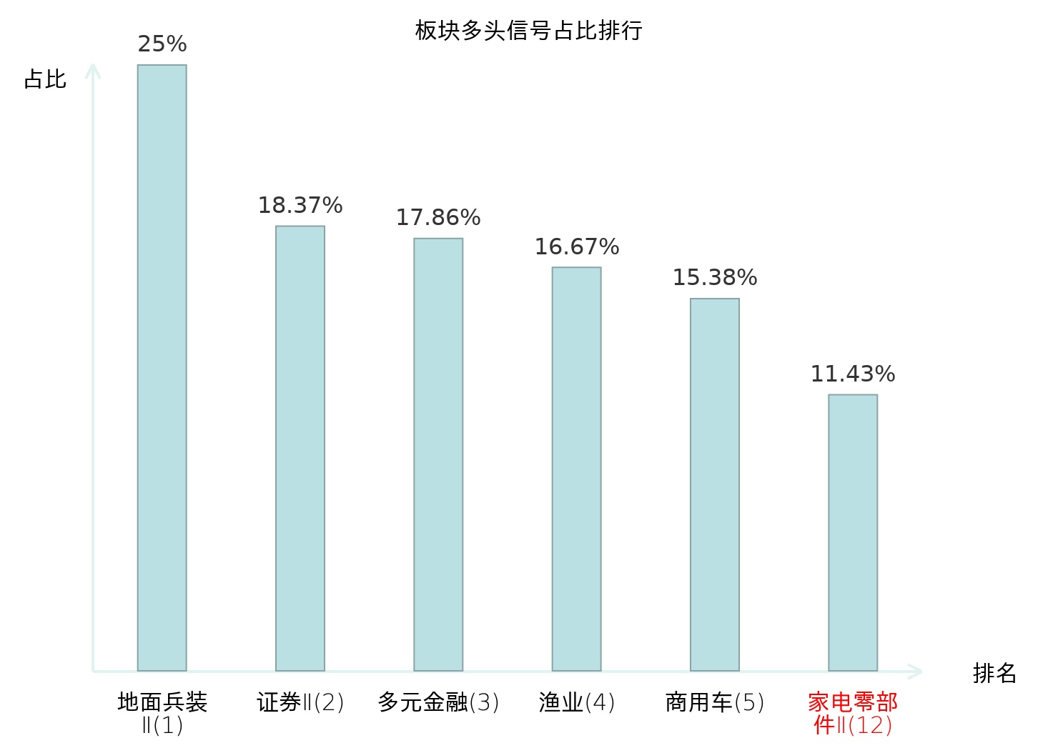 全市场所有行业板块中主力多头信号占比排名中,地面兵装Ⅱ板块位居第一。渔业板块名次提升最快,较昨日上升119位。