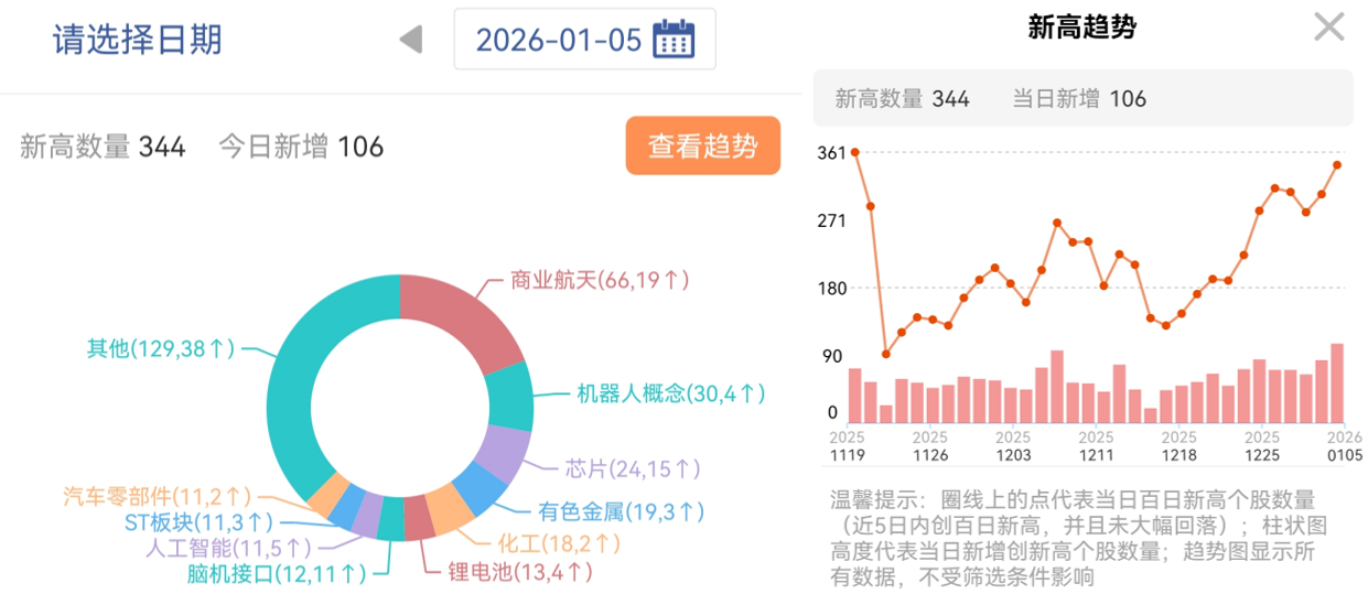 从百日新高去看,板块新高数量前4:商业航天>机器人>化工>有色金属