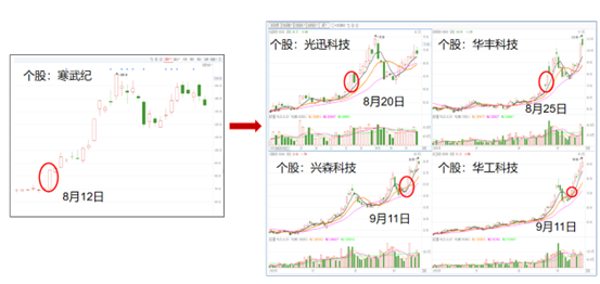 初始信号:2024 年 8月12日,寒武纪(思元芯片GPU生产商)公告上半年出货量超 8 万颗,单季度出货量突破 3 万颗,引发业绩反转预期,成为首波业绩龙头;