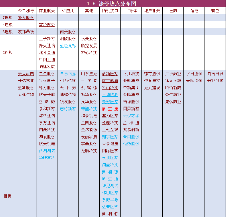 点评:脑机接口同为“马斯克”概念,作为商业航天跟机器人的补涨,今天竞价把一致性发挥到了极致,竞价就顶了5个一字,竞价结束好几个秒板,随后量化把平铺进行到底,板块指数都干到10%+了,这里应该加强版的海南板块,10cm龙头5板高度,创业板今天近20个涨停,正常也会走出一个3板高度的!参与难度比较大,尤其是这2天,会是一个残酷的淘汰散,创新医疗应该是这波的一字龙了,南京熊猫叠加商业航天有望跟他PK一下,岩山科技低价容量中军,最近大成交的比较吃香,倍益康北交所也算是唯一辨识度,其他的随机性很强,等今天明天淘汰结束才会逐渐聚焦。但作为26年第一个大题材,肯定是要关注的!!