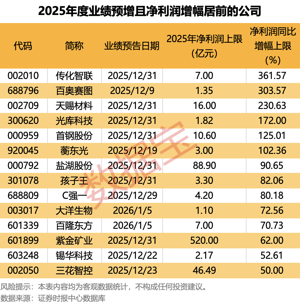 统计显示,截至目前,已有40余家公司发布2025年度业绩预告,按业绩预告类型来看,多数公司为预增。以业绩预告净利润增幅上限统计,传化智联、百奥赛图、天赐材料等预计净利润增幅均超100%。今日披露业绩预告的大洋生物,预计2025年净利润同比增长50.6%至72.56%。