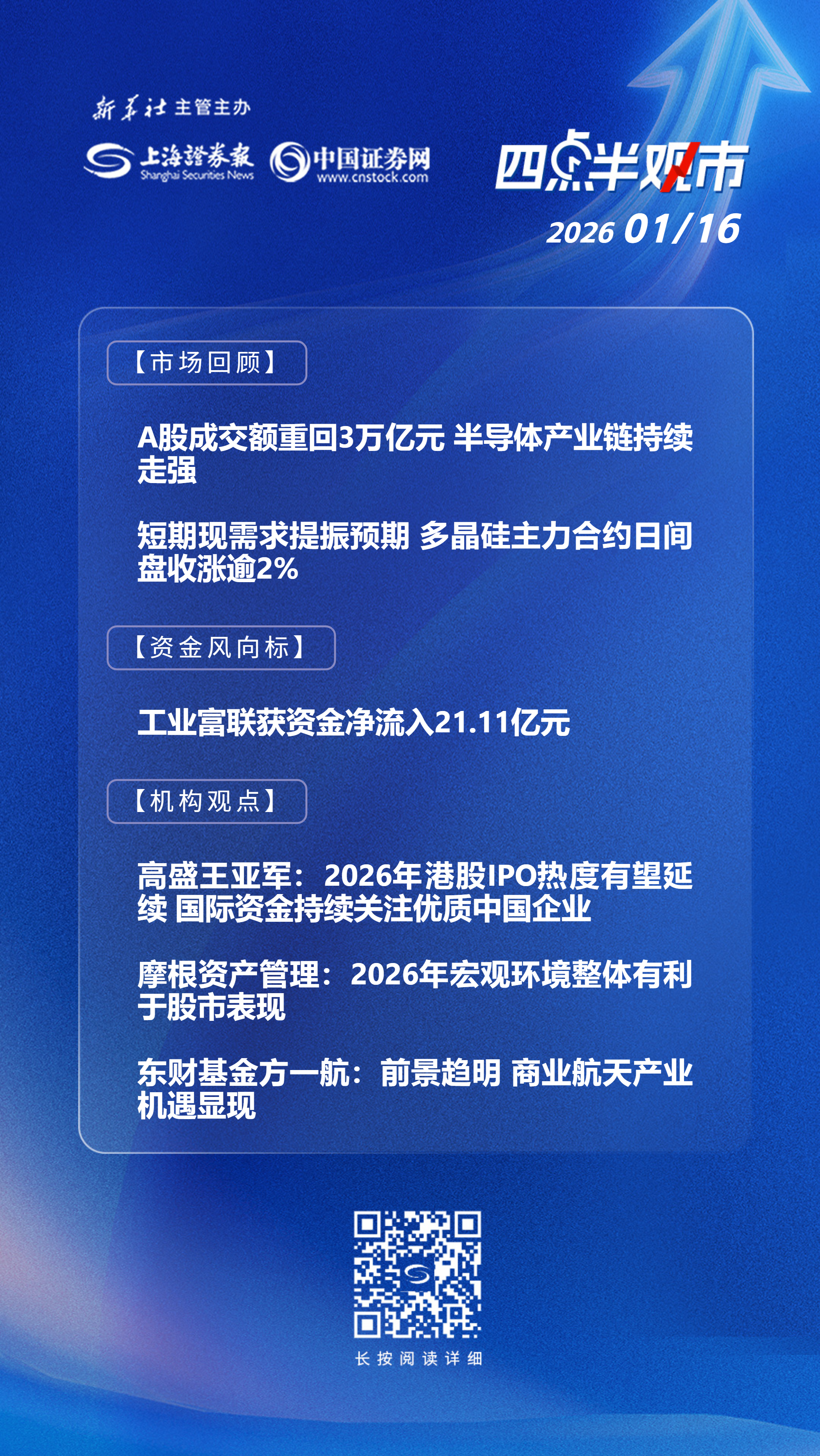 1月16日,A股市场高开回落。截至收盘,上证指数报4101.91点,跌0.26%;深证成指报14281.08点,跌0.18%;创业板指报3361.02点,跌0.20%;科创综指报1855.03点,涨1.63%。沪深北三市全天成交30564亿元,重回3万亿元上方。盘面上,半导体产业链持续活跃,长电科技涨停,股价创5年多新高。