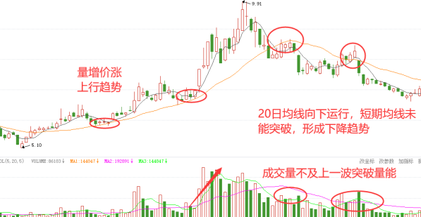 该股在前期仍是呈现量增价涨,上行趋势。随着市场的变化,20日均线由上升转下降,中期趋势被打破。并且短期均线再次挑战中期均线时,成交量不及上一波突破时量能。该股突破失败,形成下降趋势。