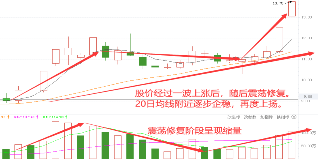 该股在长阳涨停突破后,沿5日均线逐步放量上行。随着短期均线与20日均线偏离过大,该股出现震荡修复,5日均线走平震荡,并且呈现缩量态势。随着20日均线的跟进,该股在该均线区域企稳,再次呈现量增价涨,开启新一波上行。