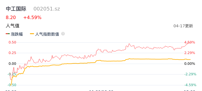 04月17日,中工国际收报8.20,股价涨幅4.59%,成交金额4.39亿元,换手率4.46%。