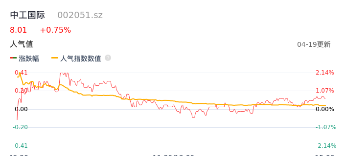 04月19日,中工国际收报8.01,股价涨幅0.75%,成交金额2.42亿元,换手率2.44%。
