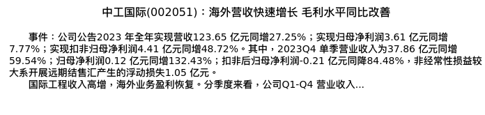 值得注意的是:2024年04月财通证券的毕春晖分析师,首次发布关于中工国际的研究报告,标题为:中工国际(002051):海外营收快速增长 毛利水平同比改善。