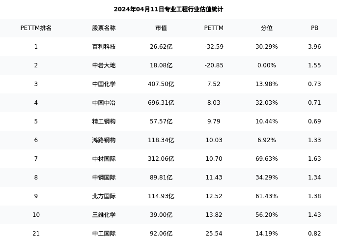 从估值角度看:中工国际最新市盈率PETTM为25.54,在行业内排名19/43,处于14.19分位。