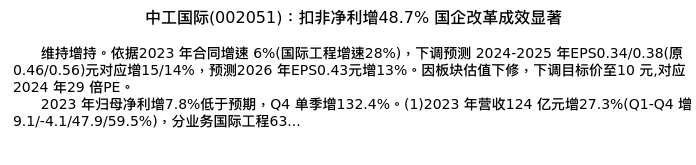 值得注意的是:2024年04月国泰君安的分析师,首次发布关于中工国际的研究报告,标题为:中工国际(002051):扣非净利增48.7% 国企改革成效显著。