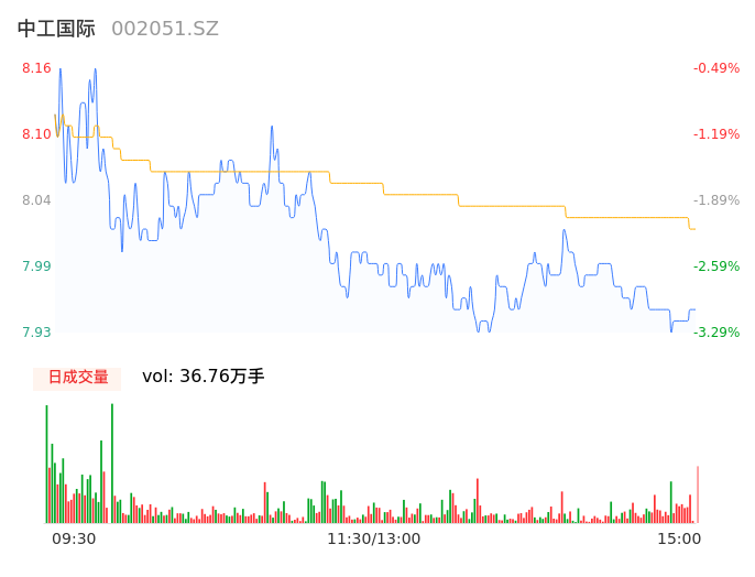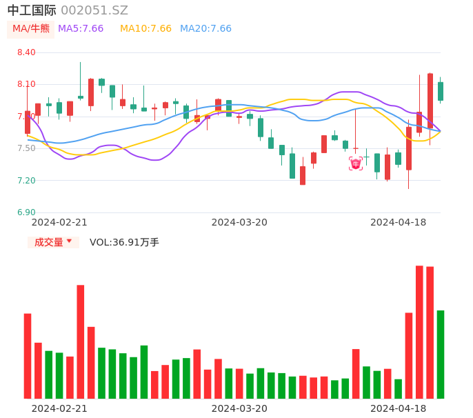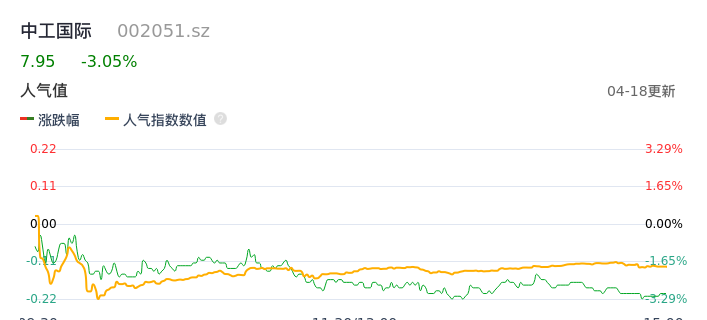 04月18日,中工国际收报7.95,股价涨幅-3.05%,成交金额2.96亿元,换手率2.98%。