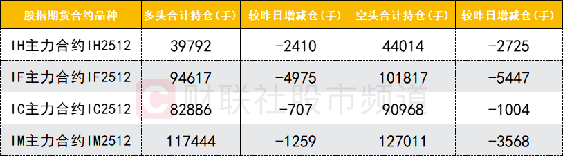 四大期指主力合约中,IH、IF、IC、IM合约多空双方均减仓,IM合约空头减仓数量较多。