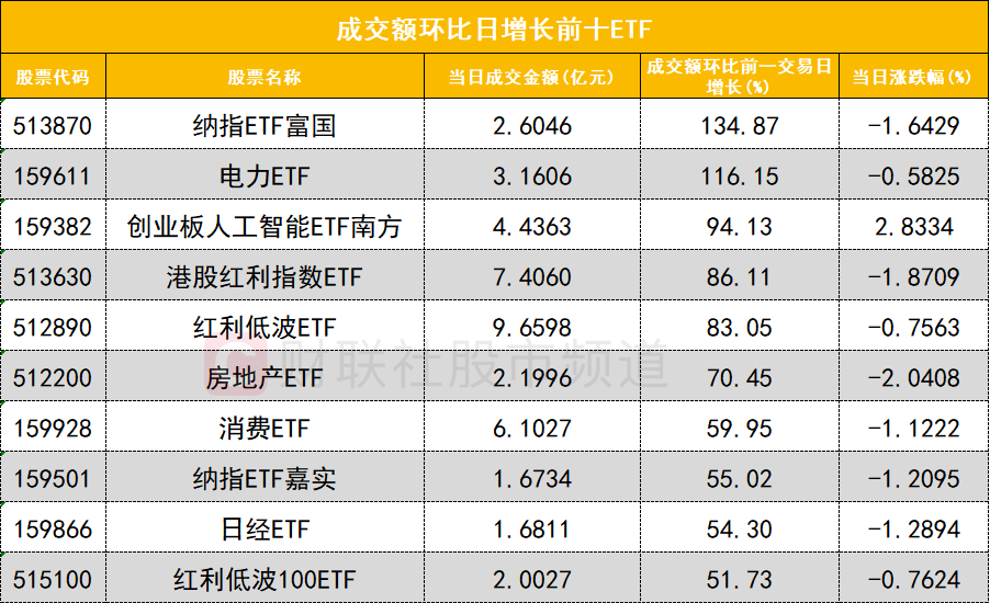 从成交额环比增长前十的ETF来看,纳指ETF富国(513870)成交额环比增长134%位居首位;电力ETF(159611)成交额环比增长116%位居次席。