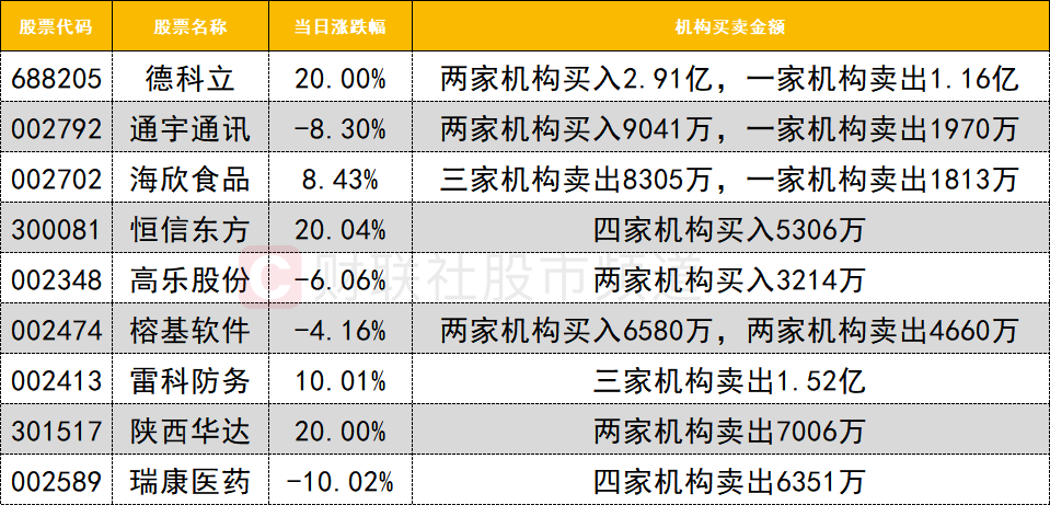 今日龙虎榜机构活跃度一般,买入方面,通宇通讯获两家机构买入9041万,同时遭一家机构卖出1970万。算力硬件概念股德科立今日20cm涨停,两家机构买入2.91亿,一家机构卖出1.16亿。