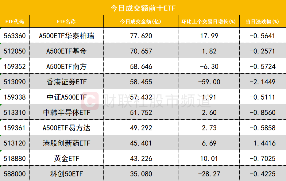 从成交额前十的ETF来看,A500ETF华泰柏瑞(563360)成交额位居首位,A500ETF基金(512050)成交额位居次席。