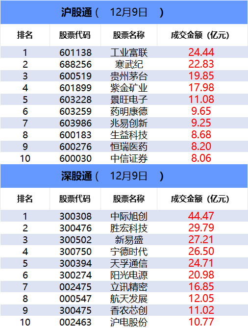 从沪股通前十大成交个股来看,工业富联位居首位;寒武纪和贵州茅台分居二、三位。