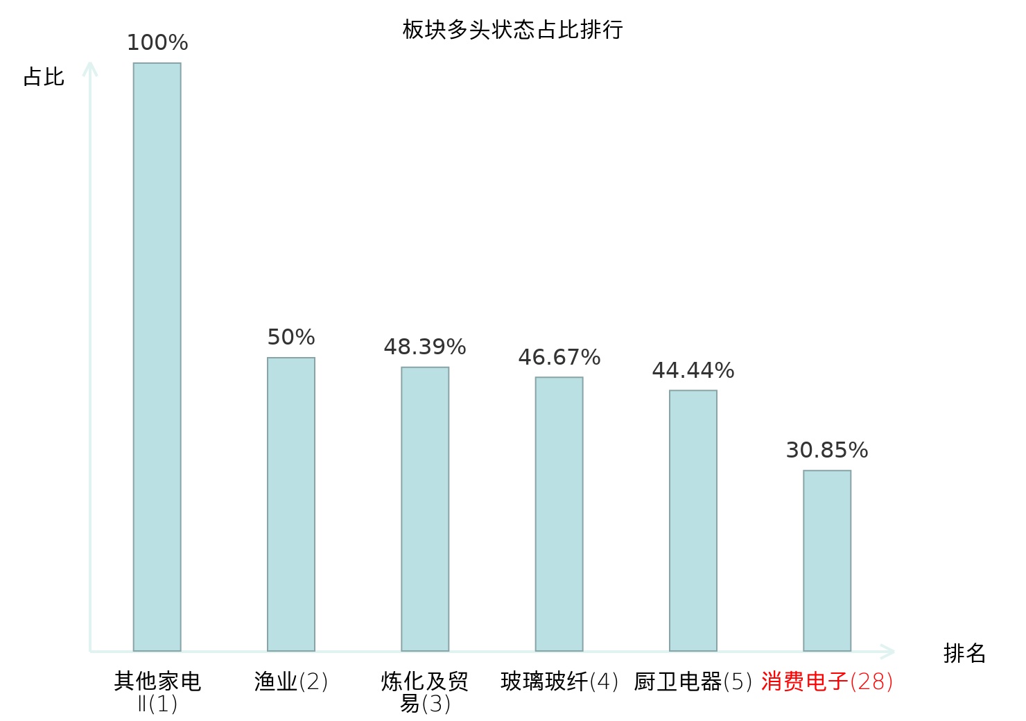 全市场所有行业板块中主力多头状态占比排名中,其他家电Ⅱ板块位居第一。冶钢原料板块名次提升最快,较昨日上升67位。