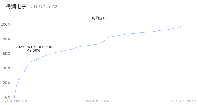 002055得润电子2025年06月05日成交186.77万手,成交金额13.06亿,相较昨日放量121.36万手,换手率31.40%,成交活跃。