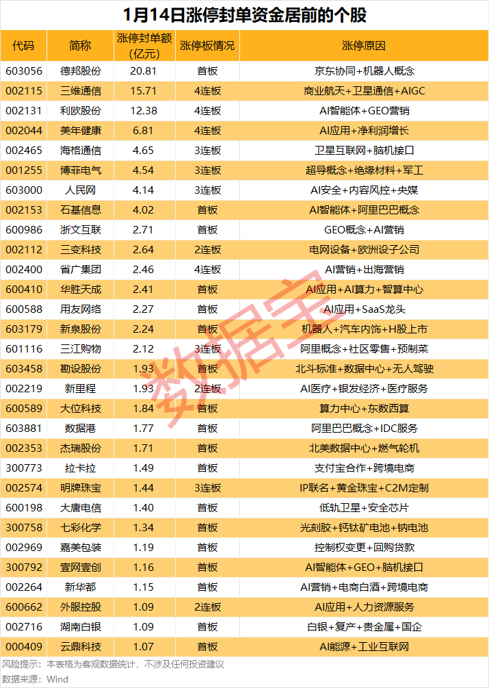 以封单金额计算,德邦股份、三维通信、利欧股份等涨停板封单资金居前,分别有20.81亿元、15.71亿元、12.38亿元。