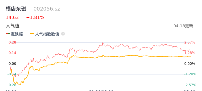 04月18日,横店东磁收报14.63,股价涨幅1.81%,成交金额2.59亿元,换手率1.10%。