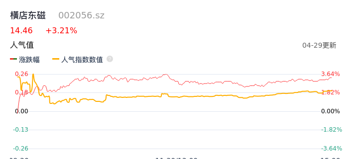 04月29日,横店东磁收报14.46,股价涨幅3.21%,成交金额2.50亿元,换手率1.07%。