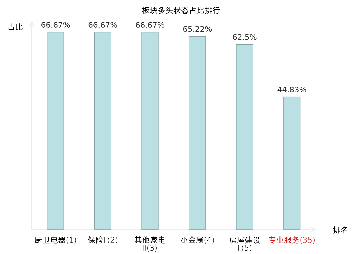 全市场所有行业板块中主力多头状态占比排名中,厨卫电器板块位居第一。乘用车板块名次提升最快,较昨日上升82位。
