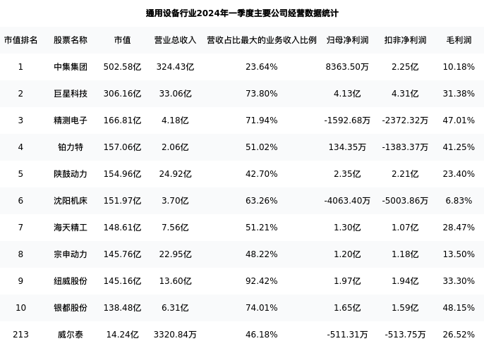 威尔泰最新报告期数据为一季度,下表汇总了通用设备行业内市值靠前的公司一季度主要经营数据
