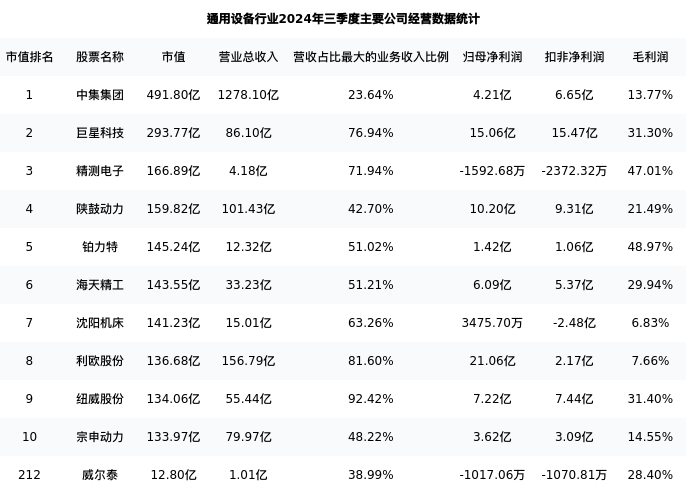 威尔泰最新报告期数据为三季度,下表汇总了通用设备行业内市值靠前的公司三季度主要经营数据