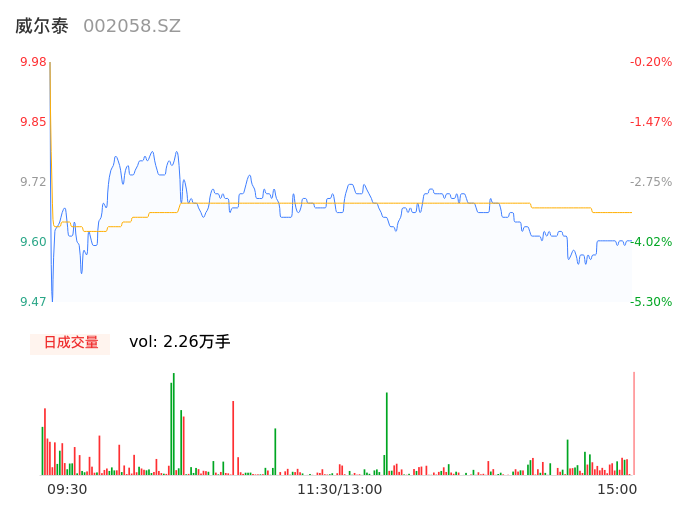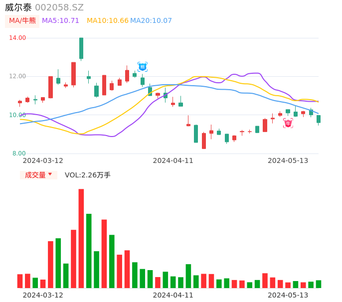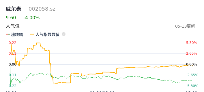 05月13日,威尔泰收报9.60,股价涨幅-4.00%,成交金额2179.69万元,换手率1.58%。