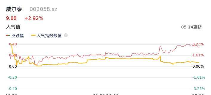 05月14日,威尔泰收报9.88,股价涨幅2.92%,成交金额2073.09万元,换手率1.48%。