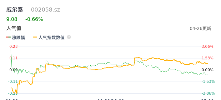 04月26日,威尔泰收报9.08,股价涨幅-0.66%,成交金额2130.27万元,换手率1.63%。