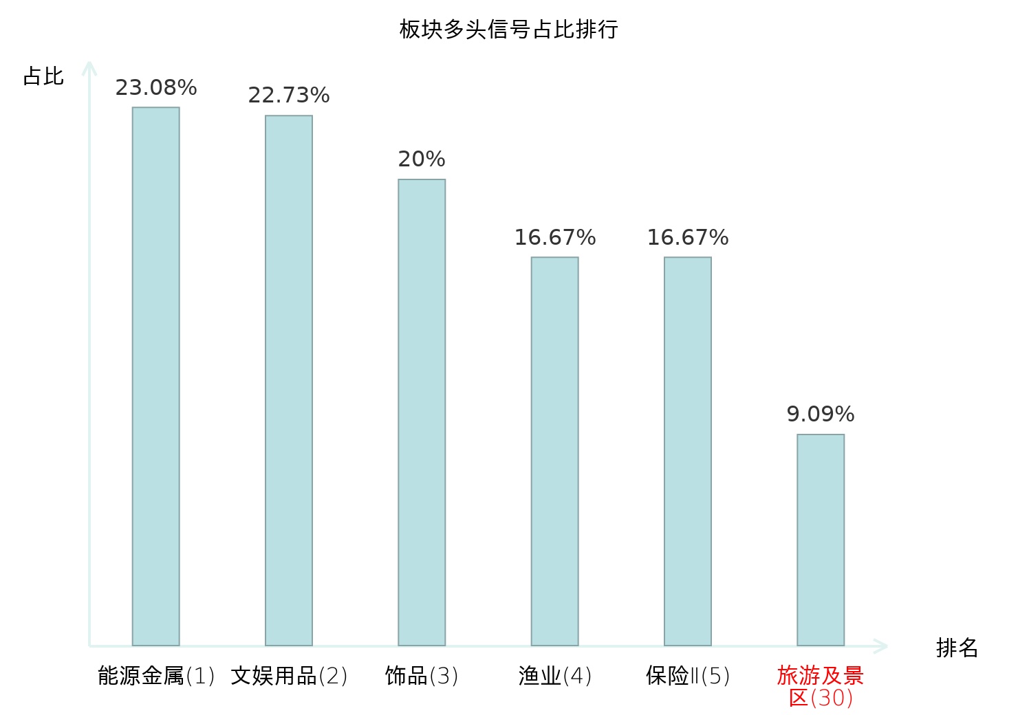 全市场所有行业板块中主力多头信号占比排名中,能源金属板块位居第一。保险Ⅱ板块名次提升最快,较昨日上升120位。