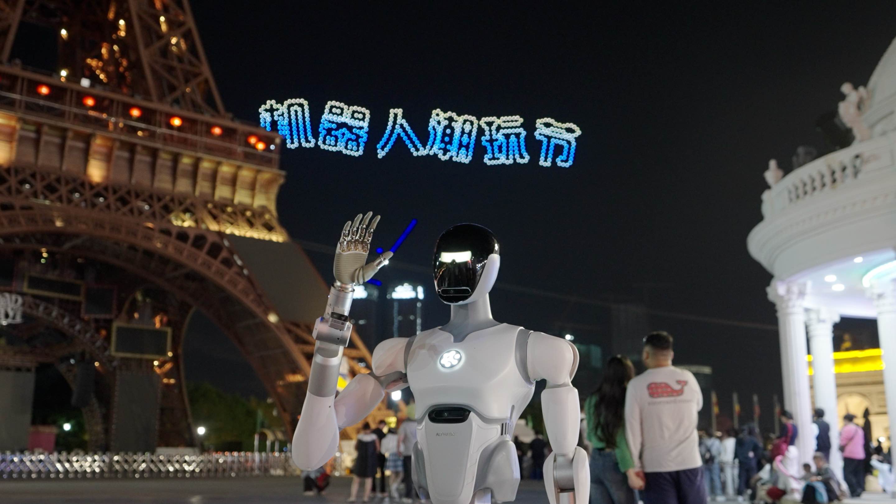 位于罗马假日广场的机器人创意集市,成为最具人气的打卡点。游客在此与机器人对弈象棋、围棋、吟诗作对,观看书法机器人挥毫送“福”,品尝机器人制作的拉花咖啡与冰淇淋,并与仿生机器恐龙进行趣味互动,亲身体验“AI+”生活场景。夜幕降临,以世界之窗“埃菲尔铁塔”为背景的“科技天幕大秀”压轴登场,无人机编队与绚丽光影交织,打造震撼视听的科幻之夜。