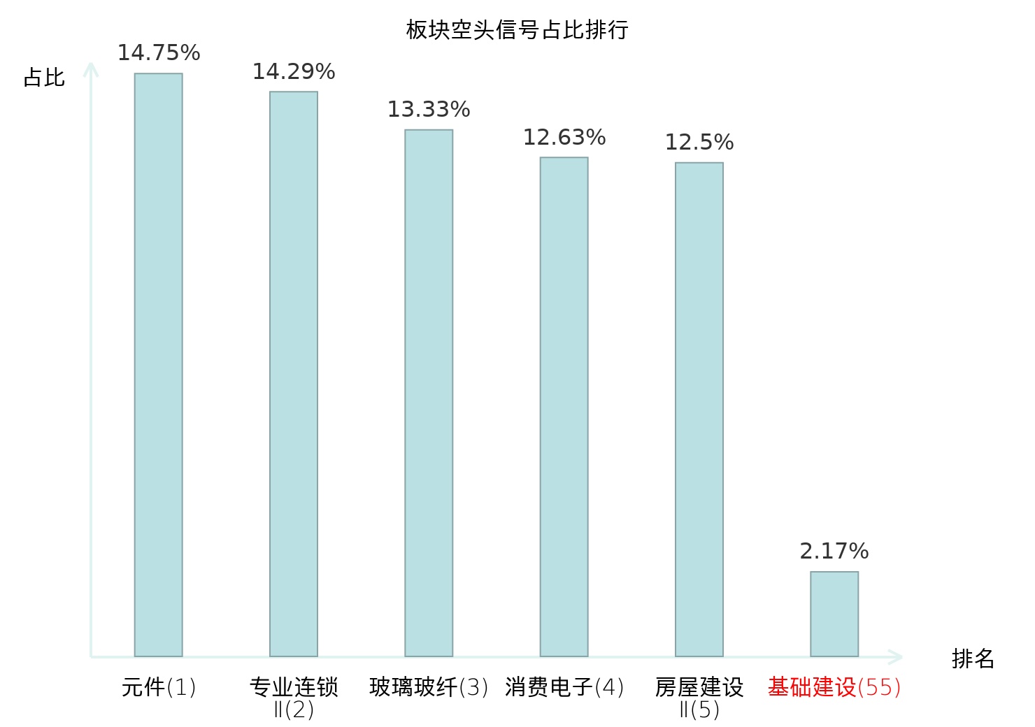 全市场所有行业板块中主力空头信号占比排名中,元件板块位居第一。电机Ⅱ板块名次提升最快,较昨日上升111位。