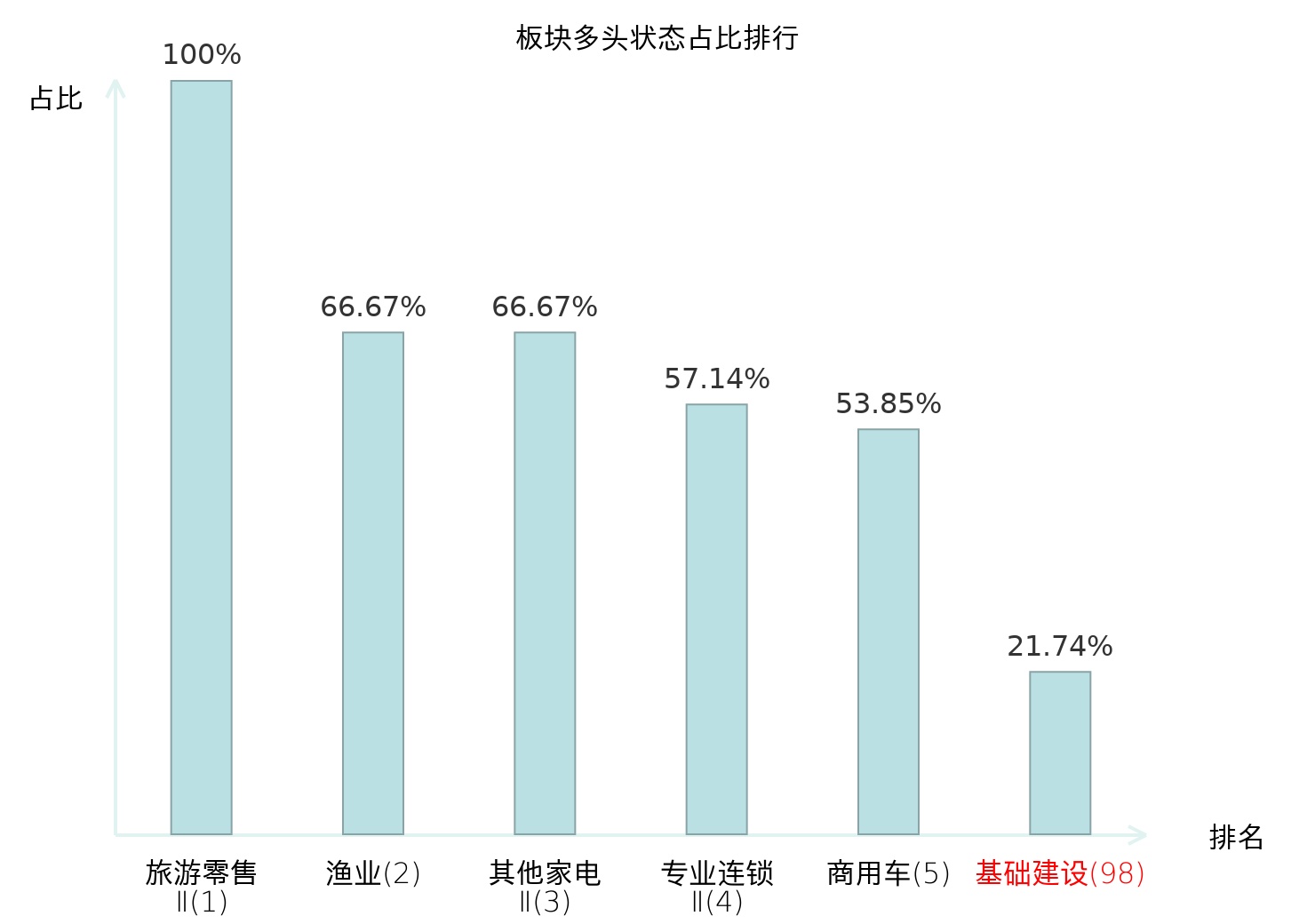 全市场所有行业板块中主力多头状态占比排名中,旅游零售Ⅱ板块位居第一。农产品加工板块名次提升最快,较昨日上升46位。