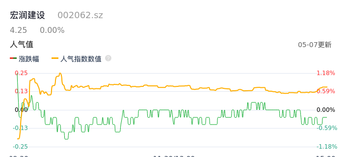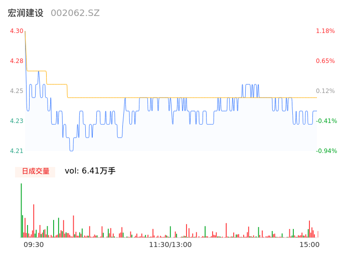 05月07日,宏润建设收报4.25,股价涨幅0.00%,成交金额2722.44万元,换手率0.65%。