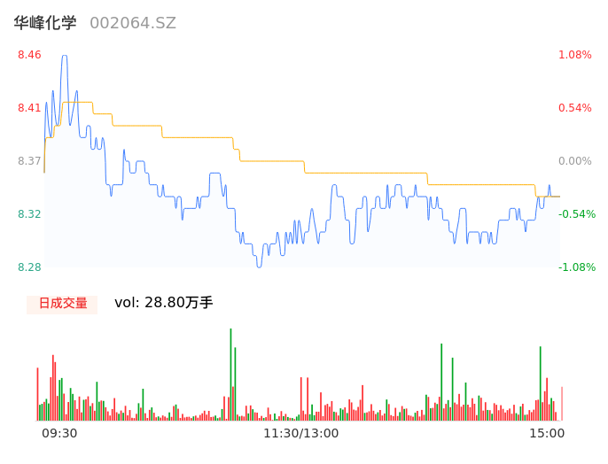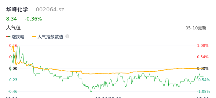 05月10日,华峰化学收报8.34,股价涨幅-0.36%,成交金额2.40亿元,换手率0.58%。