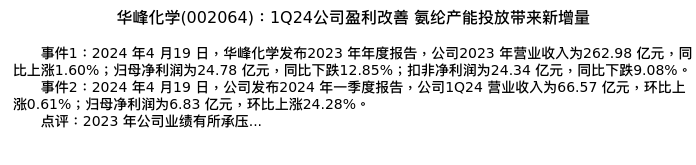 值得注意的是:2024年05月长城证券的分析师,首次发布关于华峰化学的研究报告,标题为:华峰化学(002064):1Q24公司盈利改善 氨纶产能投放带来新增量。