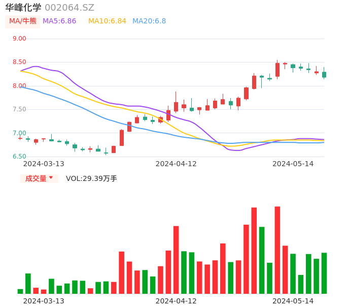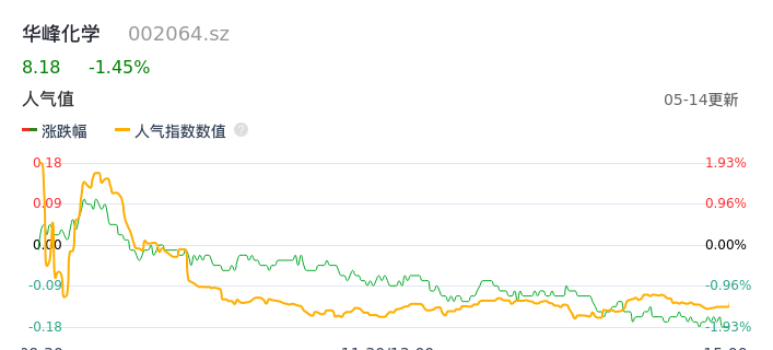 05月14日,华峰化学收报8.18,股价涨幅-1.45%,成交金额2.42亿元,换手率0.59%。