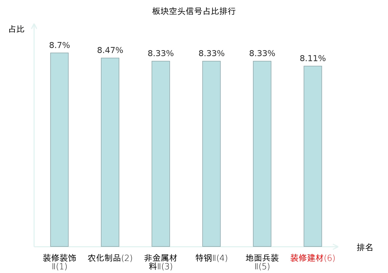 全市场所有行业板块中主力空头信号占比排名中,装修装饰Ⅱ板块位居第一。装修装饰Ⅱ板块名次提升最快,较昨日上升120位。