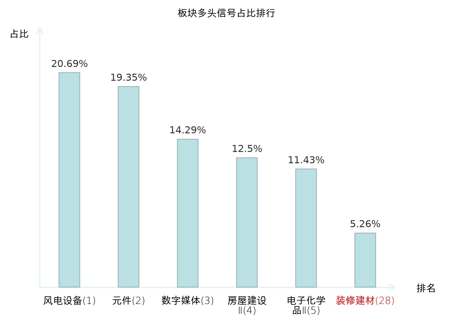 全市场所有行业板块中主力多头信号占比排名中,风电设备板块位居第一。房屋建设Ⅱ板块名次提升最快,较昨日上升116位。
