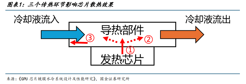 ①发热芯片与导热部件之间的热传导;②热量在导热部件内部的热扩散;③导热部件与液体介质之间的对流换热。