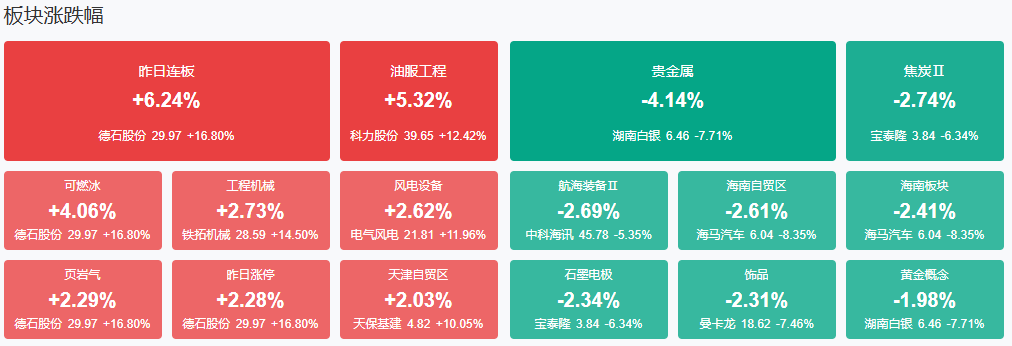 板块方面,油气、工程机械、风电设备等板块涨幅居前,贵金属、煤炭、电池等板块跌幅居前。截至收盘,沪指跌0.07%,深成指跌0.62%,创业板指0.79%。