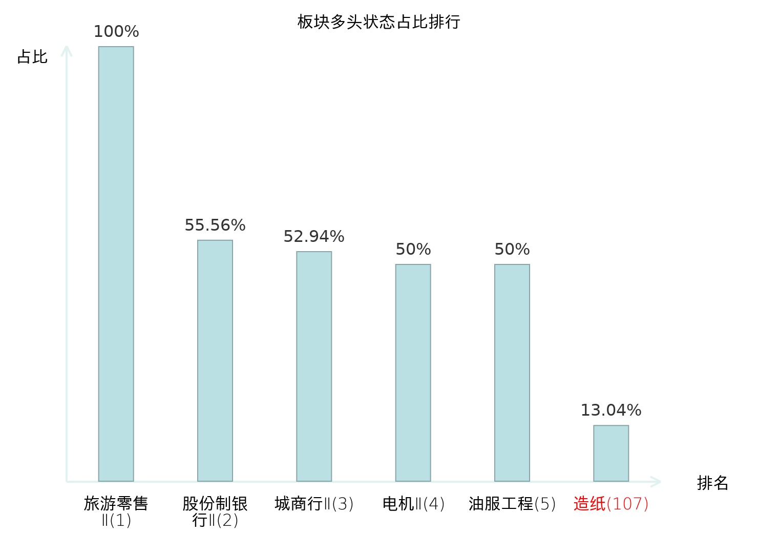 全市场所有行业板块中主力多头状态占比排名中,旅游零售Ⅱ板块位居第一。互联网电商板块名次提升最快,较昨日上升65位。