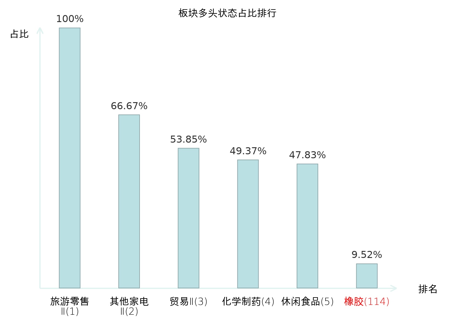 全市场所有行业板块中主力多头状态占比排名中,旅游零售Ⅱ板块位居第一。互联网电商板块名次提升最快,较昨日上升55位。