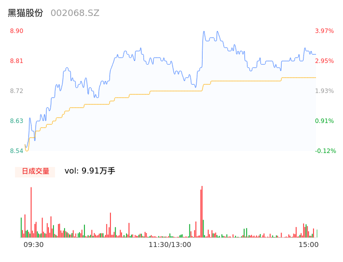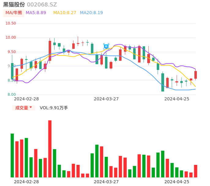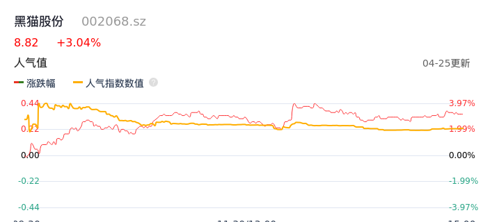 04月25日,黑猫股份收报8.82,股价涨幅3.04%,成交金额8679.67万元,换手率1.35%。