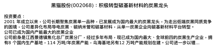 值得注意的是:2024年04月国联证券的郭荆璞分析师,首次发布关于黑猫股份的研究报告,标题为:黑猫股份(002068):积极转型碳基新材料的炭黑龙头。