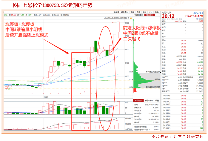 接下来我们以七彩化学(300758.SZ)的走势为例,这里面包含前两种典型,具体看下图,需要注释的一点是,第二种大阳线+涨停板模式下,尽管阳线涨幅只有3.25%,但我们注意看阳线的实体振幅也超过5%,也是符合大阳线的标准。