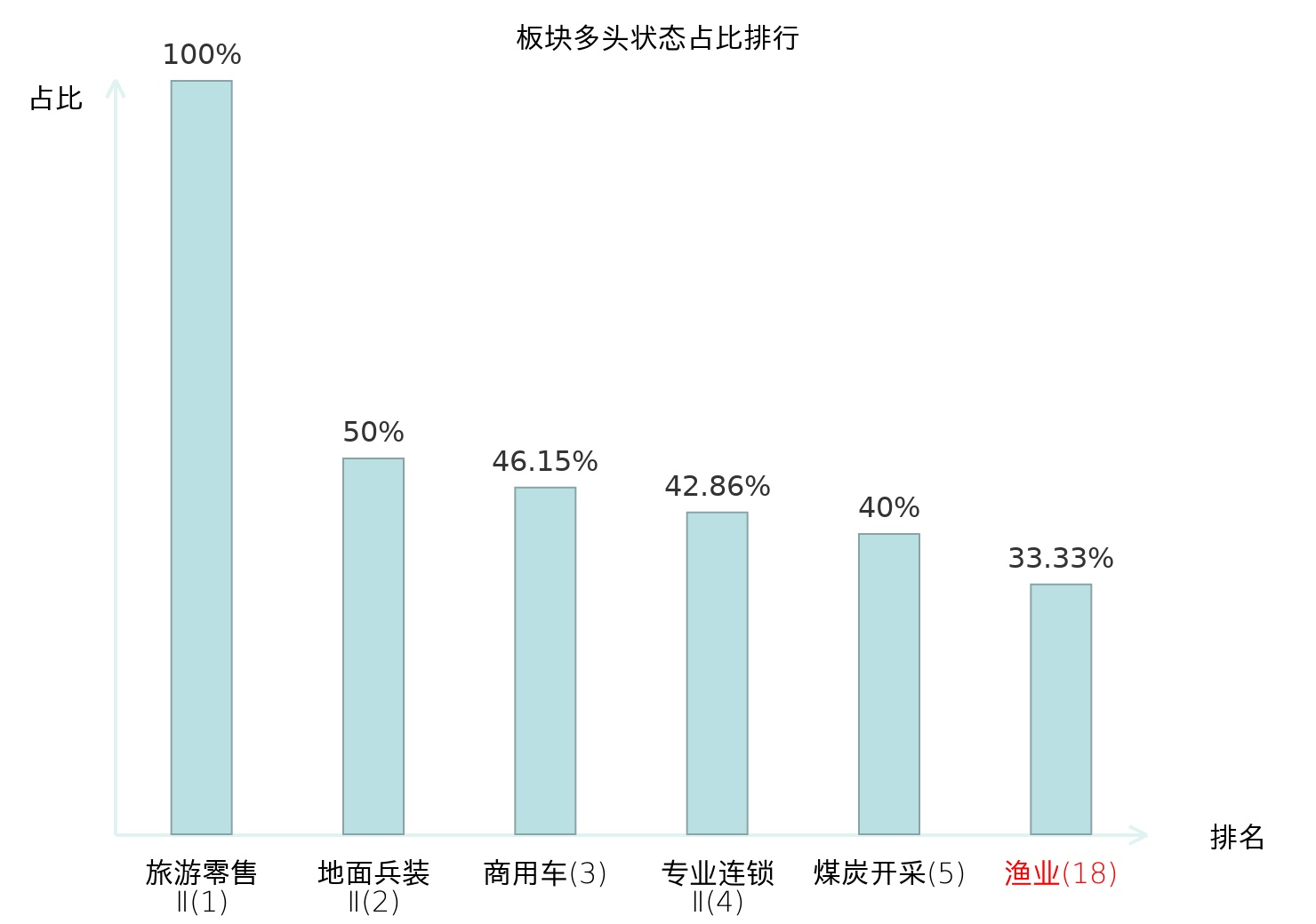 全市场所有行业板块中主力多头状态占比排名中,旅游零售Ⅱ板块位居第一。汽车服务板块名次提升最快,较昨日上升83位。