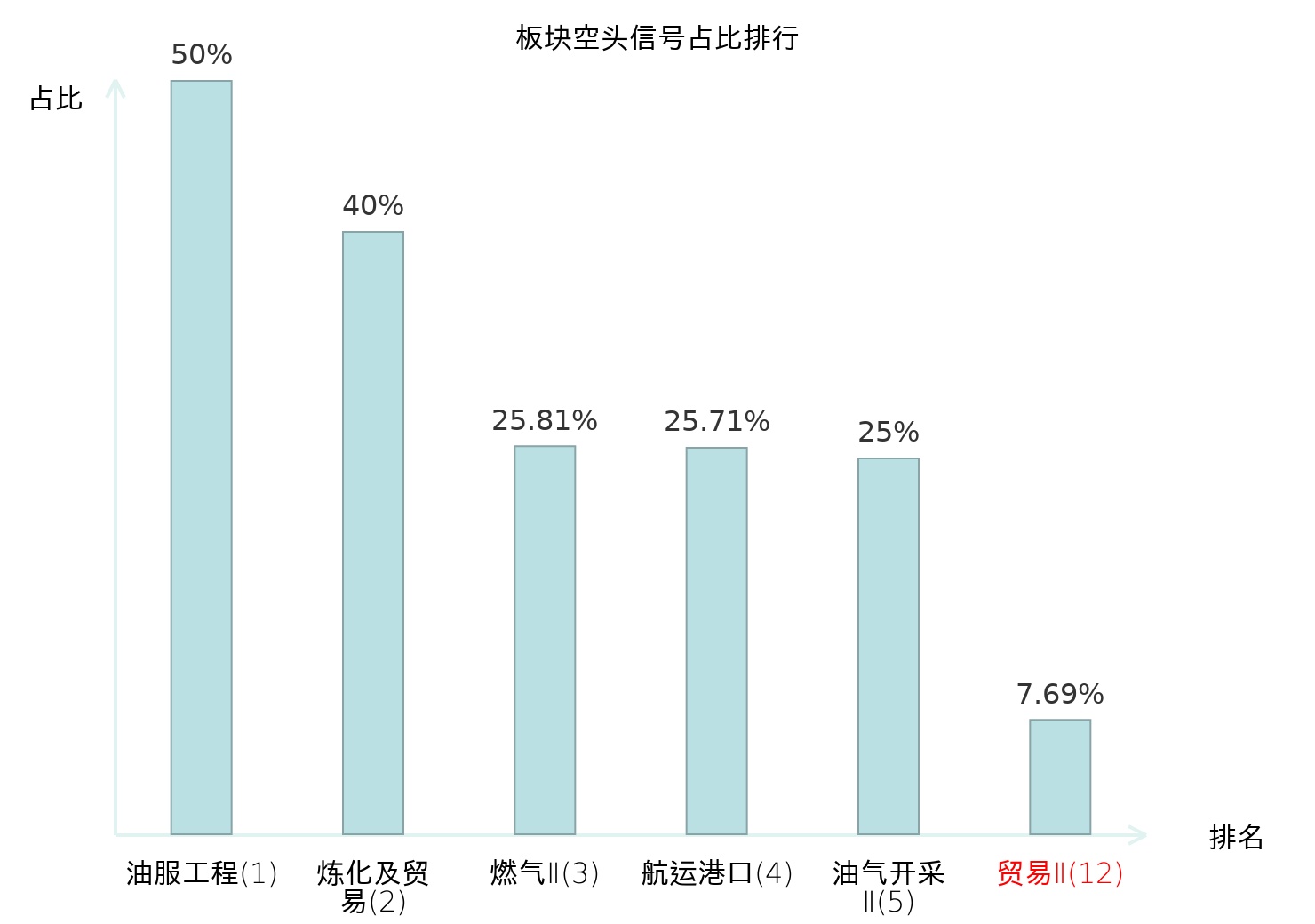 全市场所有行业板块中主力空头信号占比排名中,油服工程板块位居第一。炼化及贸易板块名次提升最快,较昨日上升124位。