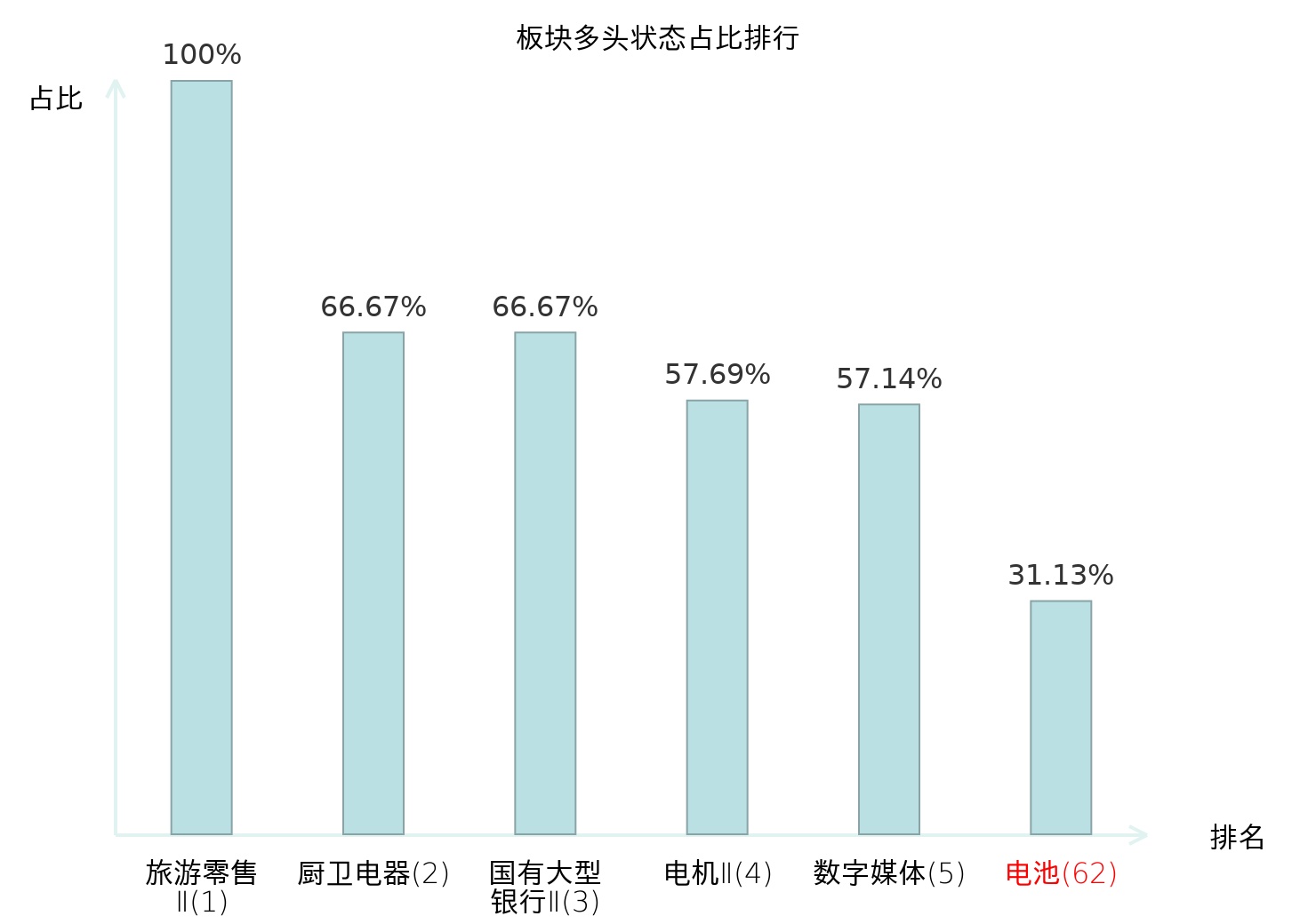 全市场所有行业板块中主力多头状态占比排名中,旅游零售Ⅱ板块位居第一。汽车服务板块名次提升最快,较昨日上升70位。